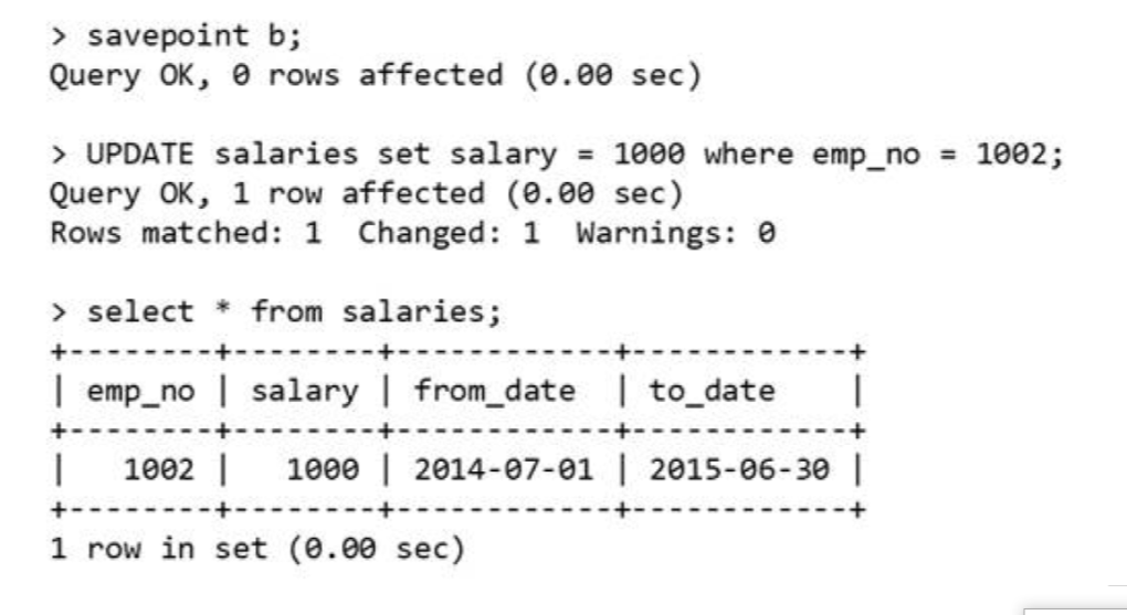 - 세이브포인트 b를 설정하고, 샐러리를 900에서 1000으로 업데이트 했다.